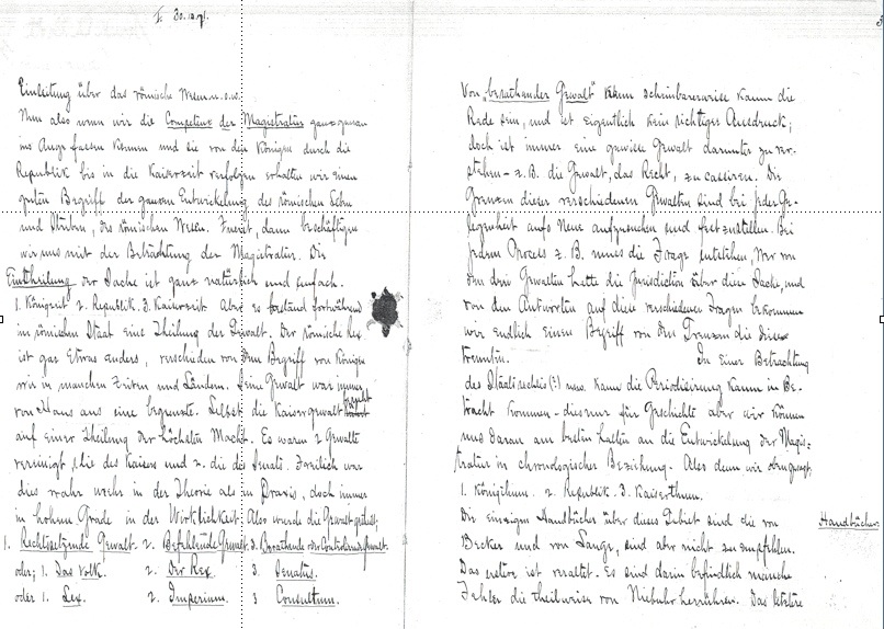 The Austin Scott papers on Mommsen—500 standard “blue-book” pages, elegantly written in clear and simple German—come from small upper-level seminars of approximately 16-24 students. The notes on the “Roman Antiquities” lectures are of special interest, because of their relationship to Mommsen’s most useful and most enduring work, Römisches Staatsrecht, only one volume of which had been published at that time, and that just recently (the first edition of volume one was issued in 1871).