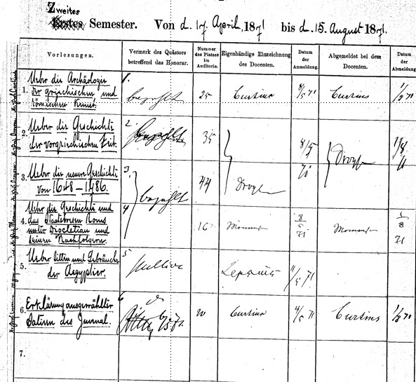 Hold on to your hat. Rutgers Classics PhD ’07 Michael Johnson has unearthed in the Special Collections and University Archives of RU a discovery of potentially great interest to the classical world. It has to do with the papers that Frank Austin Scott, tenth president of Rutgers (1891-1906), donated to the university. These included several folders filled with papers pertaining to his studies at Friedrich-Wilhelm-Universität in Berlin. In 1871-1872 he had taken courses at that institution with some of the most eminent scholars of the ancient world, then working at the peak of their respective careers.