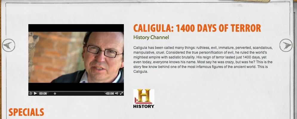 Now, whether you want to sleep on a new two-hour History Channel special devoted to the notorious emperor is a different matter. It’s called Caligula: 1400 Days of Terror—a reference to his short and violent reign of March 37 to January 41. The US premiere airs from 9-11 PM on Tuesday 9 October 2012. (It already debuted in Australia and NZ in time for that August anniversary; and it premieres in Italy Sunday 28 October.)