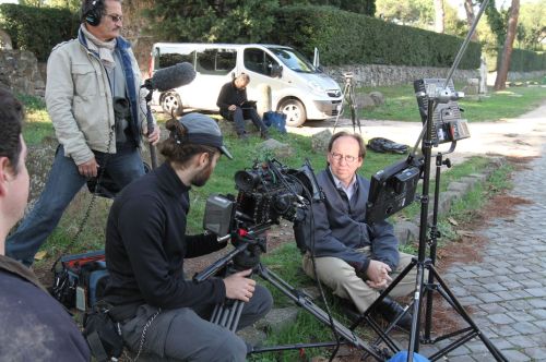 Corey Brennan (seated) on location on the Via Appia Antica during the filming of Caligula: 1400 Days of Terror. Credit: NorthSouth Productions