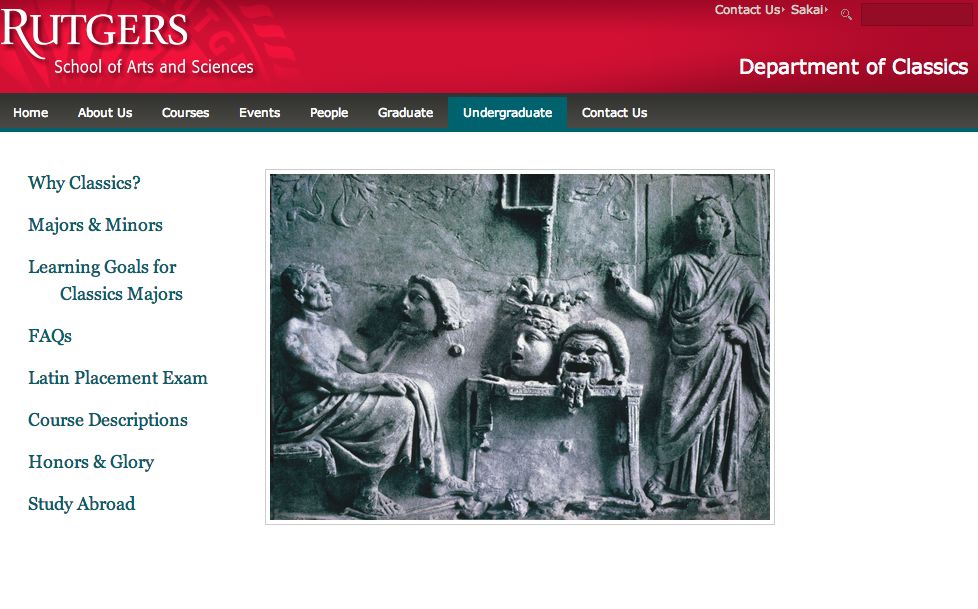 The RU Classics website contains much crucial information on the undergraduate program. It’s pretty much all there, including answers to the question “why study Classics“, a detailed exposition of major and minor requirements, the Department’s learning goals, our undergraduate Honors program, opportunities for study abroad, all topped off by miscellaneous Frequently Asked Questions (FAQs). Oh, and all the details on our internationally-renowned faculty of seven.