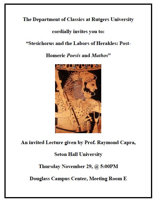 Two and a half hours before kickoff, at 5.00 PM in Douglass Campus Center Meeting Room E, Professor Raymond Capra from Seton Hall University will deliver a lecture entitled, “Stesichorus and the Labors of Herakles: Post-Homeric Poesis and Muthos.”