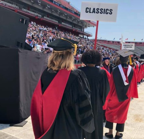 Professor Emily Allen-Hornblower, Classics Undergraduate Director, enters HighPoint.com Stadium at the start of the Rutgers School of Arts & Sciences convocation, preceded by Classics Administrator Tandria Cooper (with placard)