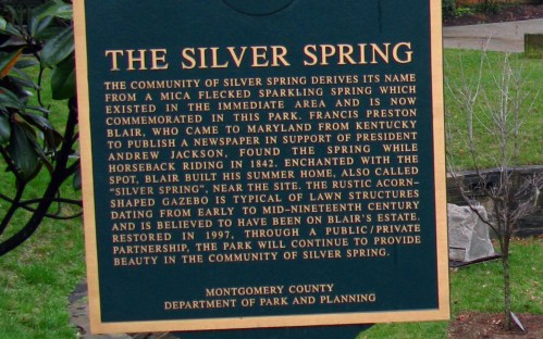 In 1842, Washington Globe newspaper editor Francis Preston Blair and his daughter Elizabeth Blair came upon a “mica-flecked” spring just north of the District of Columbia line. They fell in love with the property, so much so that Blair Sr. bought it up, together with a large swath of the land that surrounded it, and there built a large summer home which he called “Silver Spring“. The Blair family’s primary residence would remain the famous Blair House in DC—now part of the complex that forms the US President’s guest house.